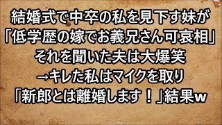 【スカッと】結婚式で中卒の私を見下す妹が「低学歴の嫁でお義兄さん可哀相w」それを聞いた夫は大爆笑→キレた私はマイクを取り「新郎とは離婚します!」結果w【修羅場】